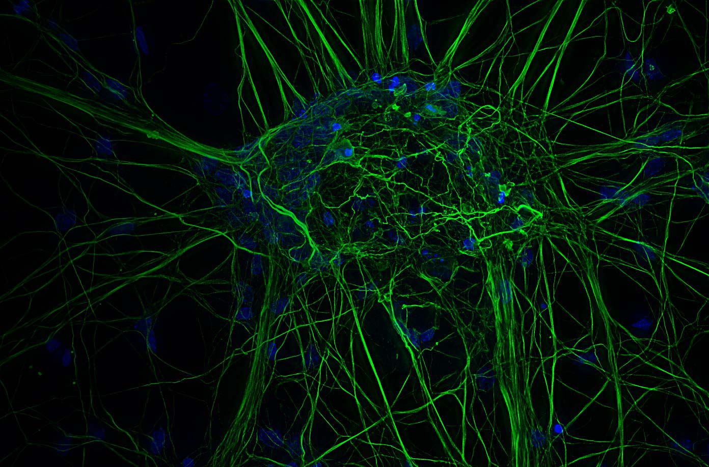Interaktives Bild: Kultivierte kortikale Nervenzellen. Grün, Beta-III-Tubulin; blau, Kerne. Bildstapel mit 59 Ebenen für ein Volumen von 21 µm, erfasst mit einem THUNDER Imager 3D Cell Culture. Rohbild im Vergleich mit einem mit THUNDER Large Volume Computational Clearing aufgenommenem Bild. Probe mit freundlicher Genehmigung von: FAN GmbH, Magdeburg (Deutschland).