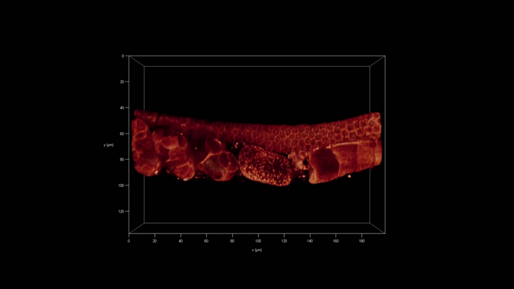 While the accessible z-volume of the sample is defined by the objective´s long working distance (620 µm), the accessible x-dimension is constrained only by the stage travel range. Large fields of view can be achieved through tiled acquisitions.