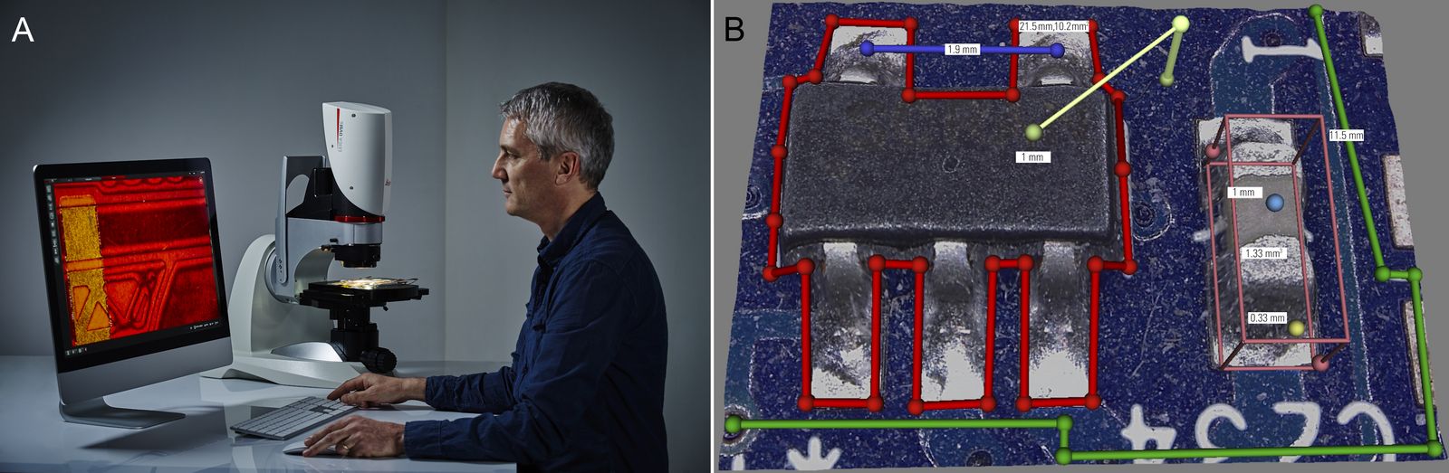When only basic 2D measurements, e.g., dimensions of sample features and structures, distances between features or structures, angles between intersecting structures, or areas of various geometrical shapes, are required, then a Leica microscope using the Enersight software is an optimal solution (refer to figure 4). It can be operated even without the need of a computer.