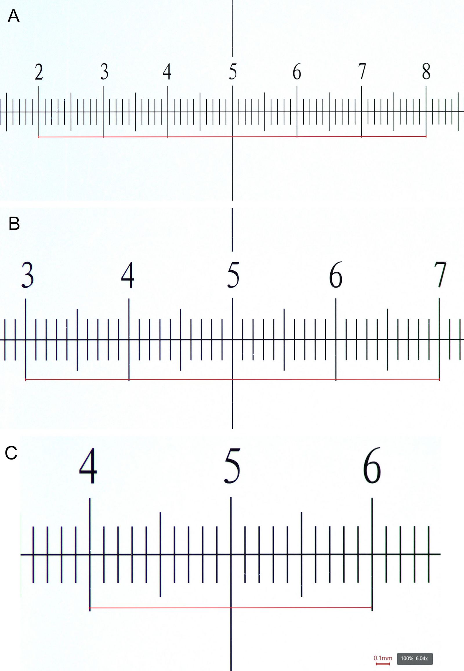 For accurate calibration at higher magnification values, it is important to verify that the distance line starts and ends on the same side or edge of the stage micrometer mark, e.g., from the left (or right) edge to the left (or right) edge (refer to fig. 4C and the video above).