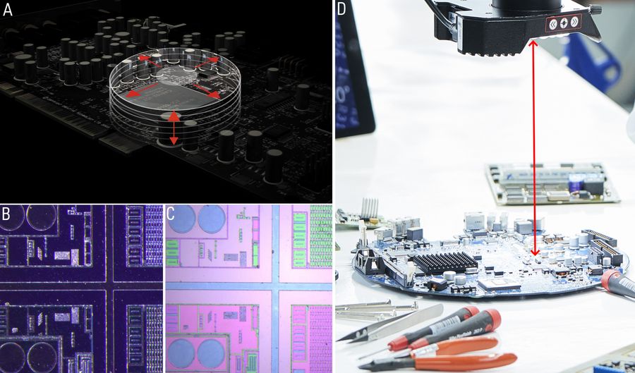 An additional challenge encountered for inspection with rework which can cause inefficiency is the inability to quickly change the microscope settings allowing users to go from a sample overview to fine details. This challenge arises when using a stereo microscope which does not provide enough depth of field, field of view, and resolution, thus requiring a lot of adjustments.